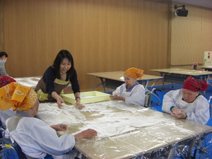 入居者の方々も真っ白なエプロンを身につけ、一生懸命おもちを丸めて下さいました。