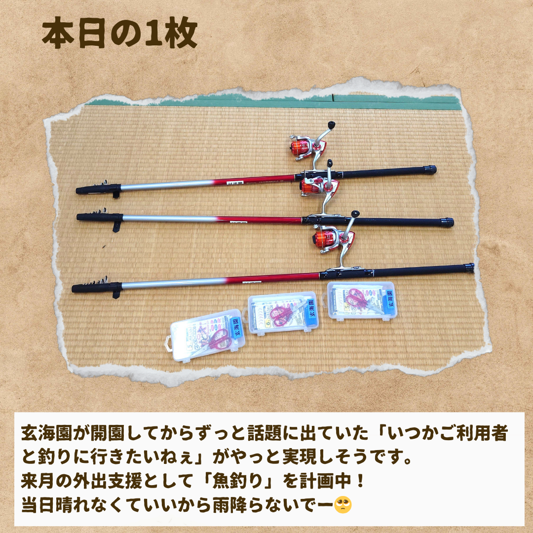 一言日記投稿 2024年04月25日 いよいよ週末からGWに突入ですね。 玄海園ではGWが終わった5月9日に PR委員会活動として外津漁港に魚釣りに行くことを計画しており、 釣れたらみんなで食べたいねぇと言いながら今からわくわくしています。