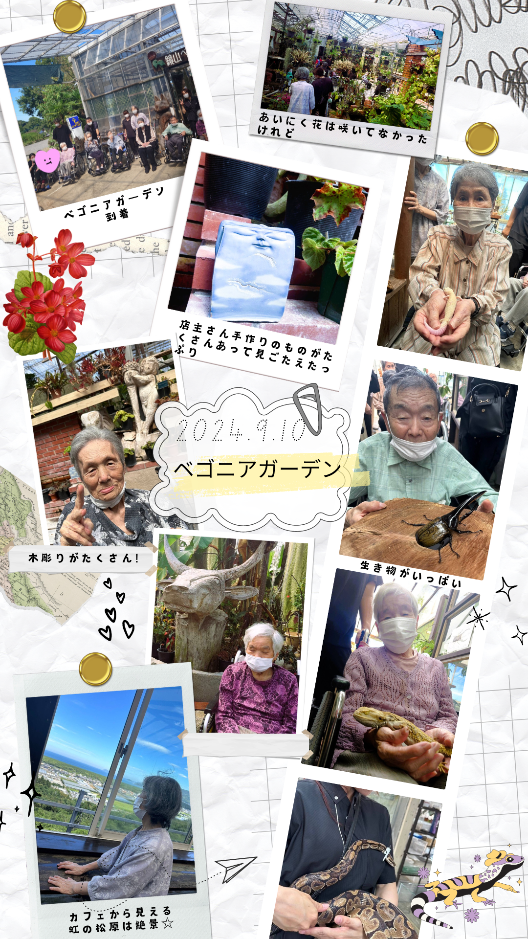 生き物コーナーでは夏休み期間の名残でクワガタやカブト虫などがいて「大きかねぇ!」と皆さん興味津々。蛇やトカゲなどの爬虫類もいて苦手な方もいらっしゃいましたが背中だけ触ってみようかな、しっぽだけ触ってみようかな…と恐る恐るタッチに挑戦してみているかたもちらりほらり…。爬虫類が好きな職員はルンルンと蛇を持ちあげて楽しんでました。ほかにも山羊、鶏、鯉、亀、デグー、猫などもいて餌やりやふれあいを楽しまれ、最後にベゴニアガーデンカフェエリアから見る虹の松原の景色を楽しんで帰宅しました。みなさん楽しかったぁと言ってくださったのでまた機会があれば遊びに行きたいと思います。